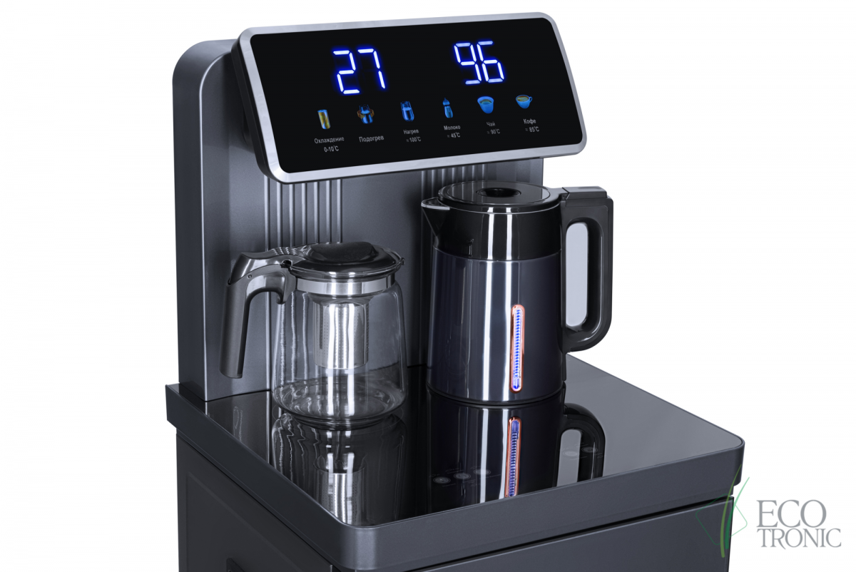 Большая и удобная панель управления с возможностью задать температуру нагрева (4 режима нагрева). Пульт дистанционного управления. Нижняя загрузка бутыли. Два чайника — для кипячения и заварочный. Чайник кипячения внутри выполнен из цельнотянутой нержавеющей стали, а снаружи имеет индикацию при нагре