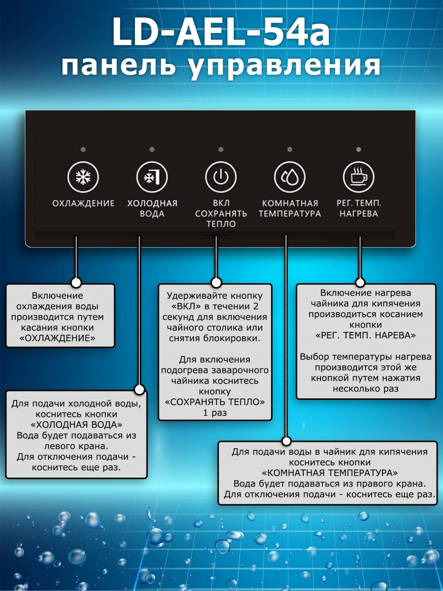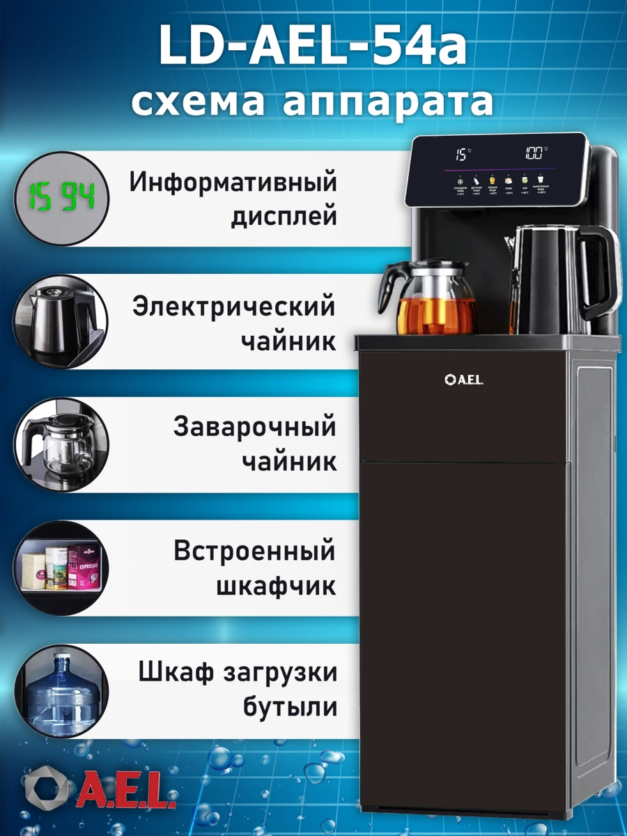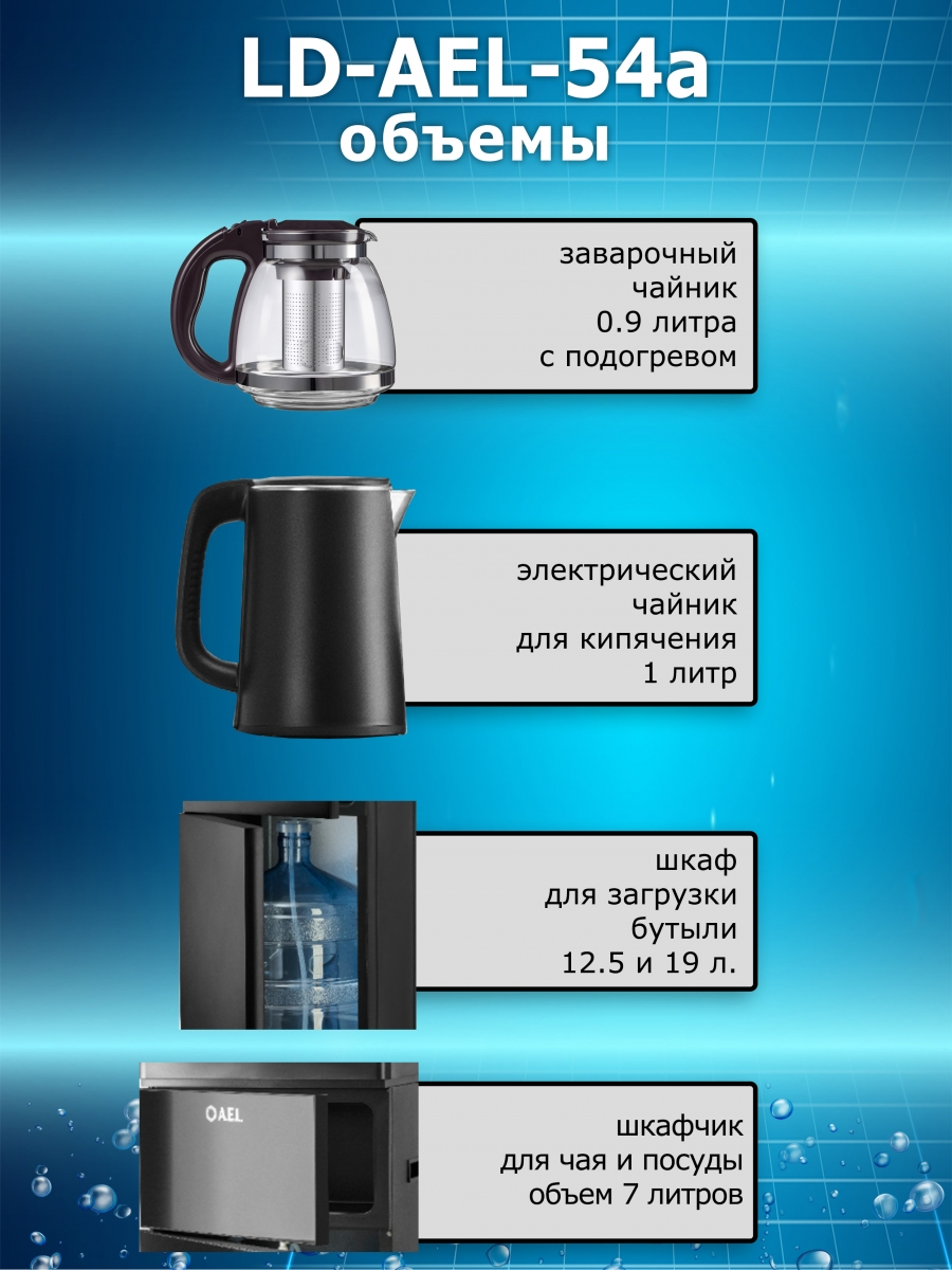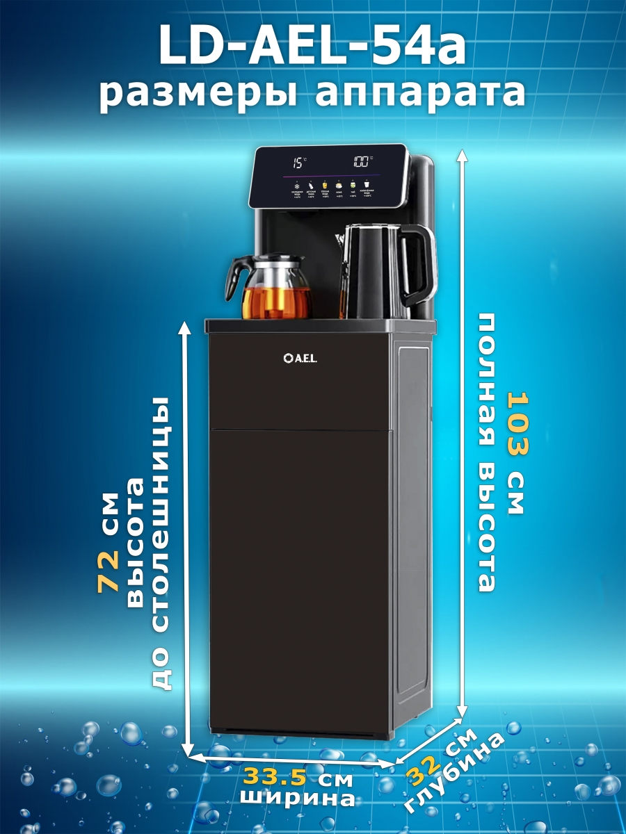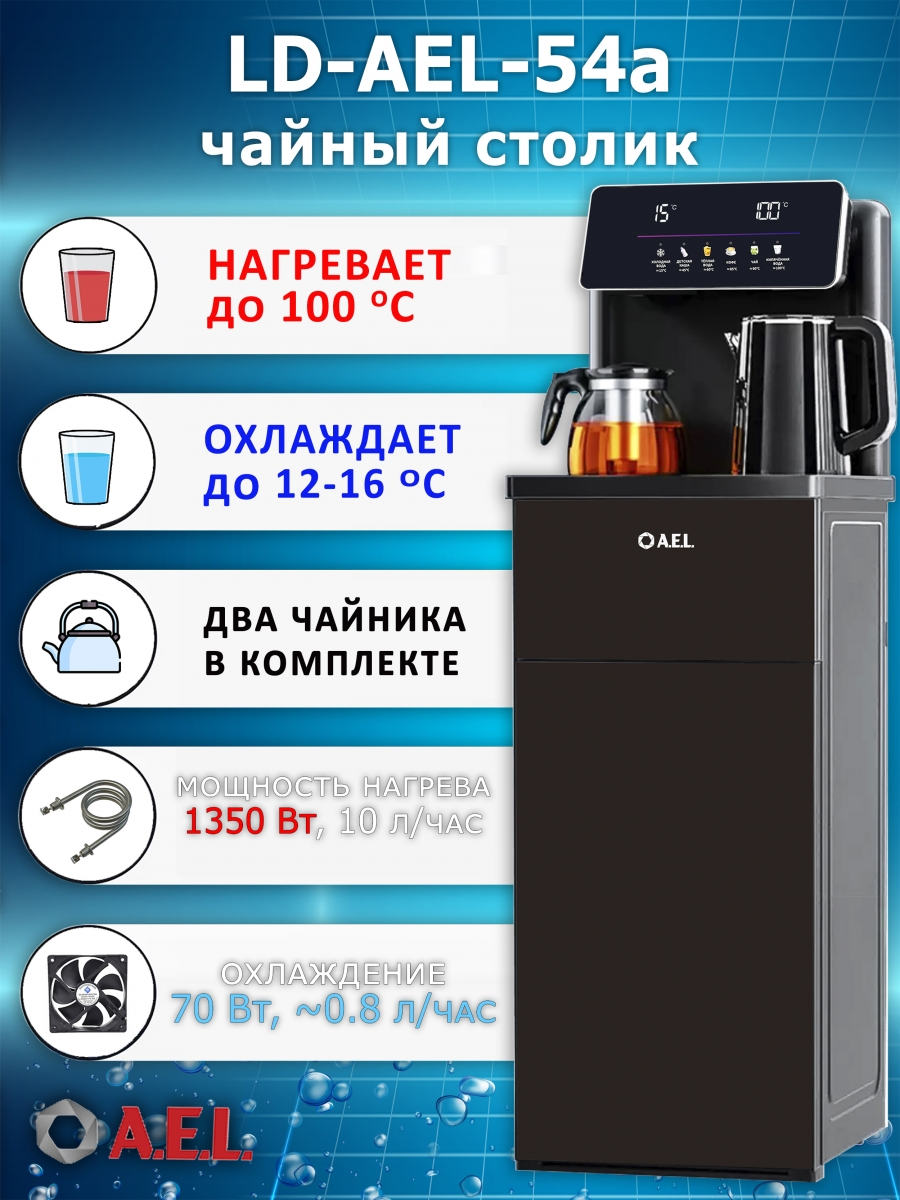 Кулер с чайным столиком Тиабар LD-AEL-54a black, нагрев и охлаждение, производительность нагрева 8 л/ч, производительность охлаждения 0.7 л/ч, мощность нагрева 1350 Вт, мощность охлаждения 75 Вт, размещение напольное