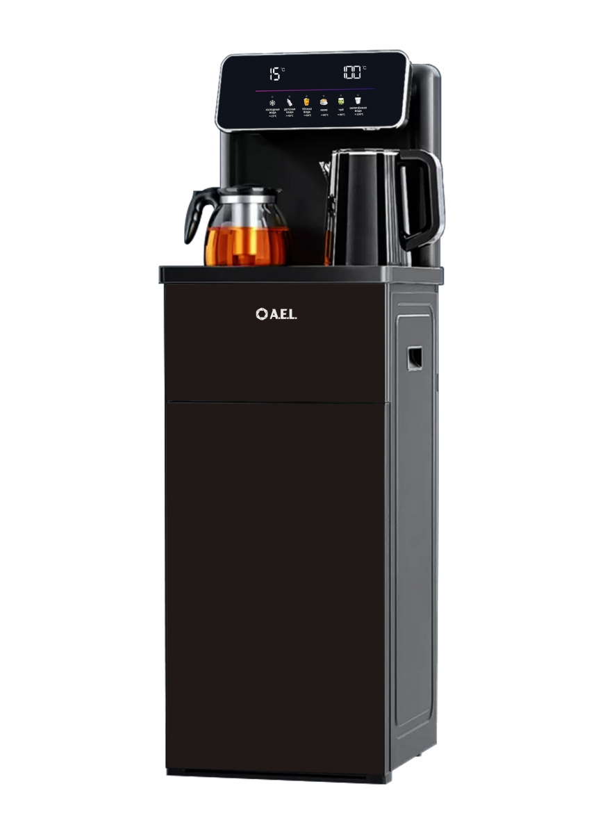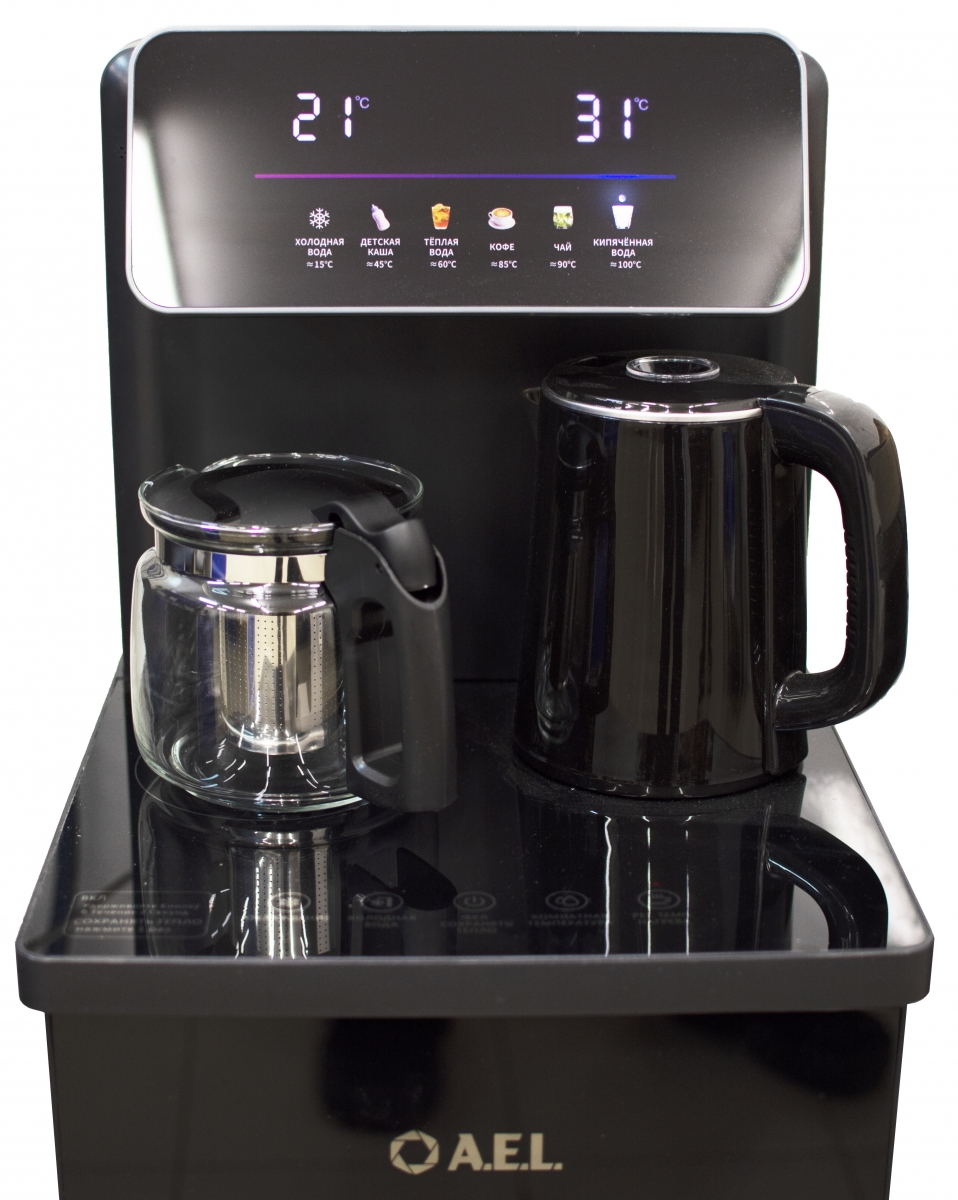 Оригинальное исполнение кулера с нижней загрузкой бутыли и с электронным охлаждением, состоит из заварочного и электрического чайников, сенсорной панели управления и шкафчика для хранения. Яркая световая индикация и информативный дисплей сообщат о текущем режиме и подключении к сети. Цвет черный. Объем чайников 1 литр. Размер в собранном виде 340 x 325 x 1040 мм.