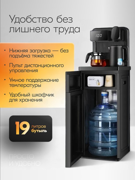 Нижняя загрузка бутыли исключает необходимость подъема тяжестей. Сенсорная панель управления и дисплей упрощают выбор режимов. Встроенный шкаф создает дополнительное удобное место для хранения с полочкой для чашек.