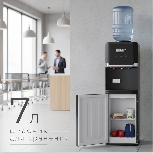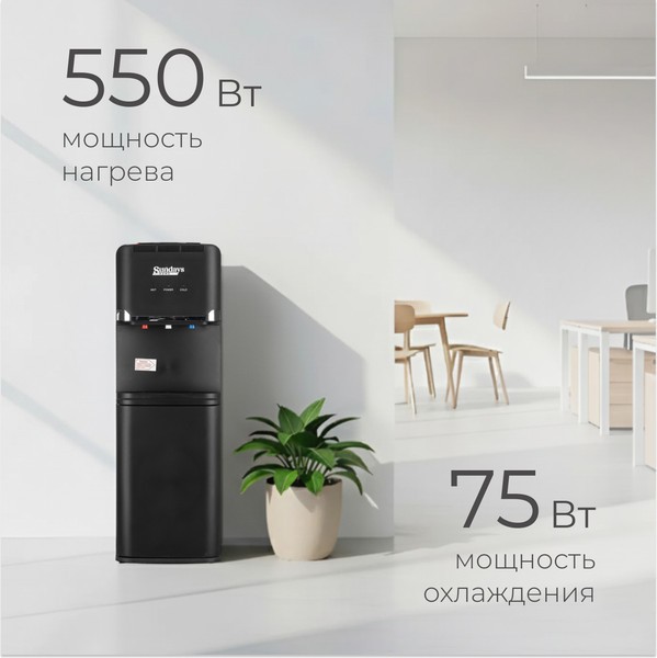 Кулер для воды Sundays SL-85 (черный) с охлаждением и нагревом, верхняя загрузка бутыли, встроенный шкаф 7 л, 2 крана с нажимом кнопкой