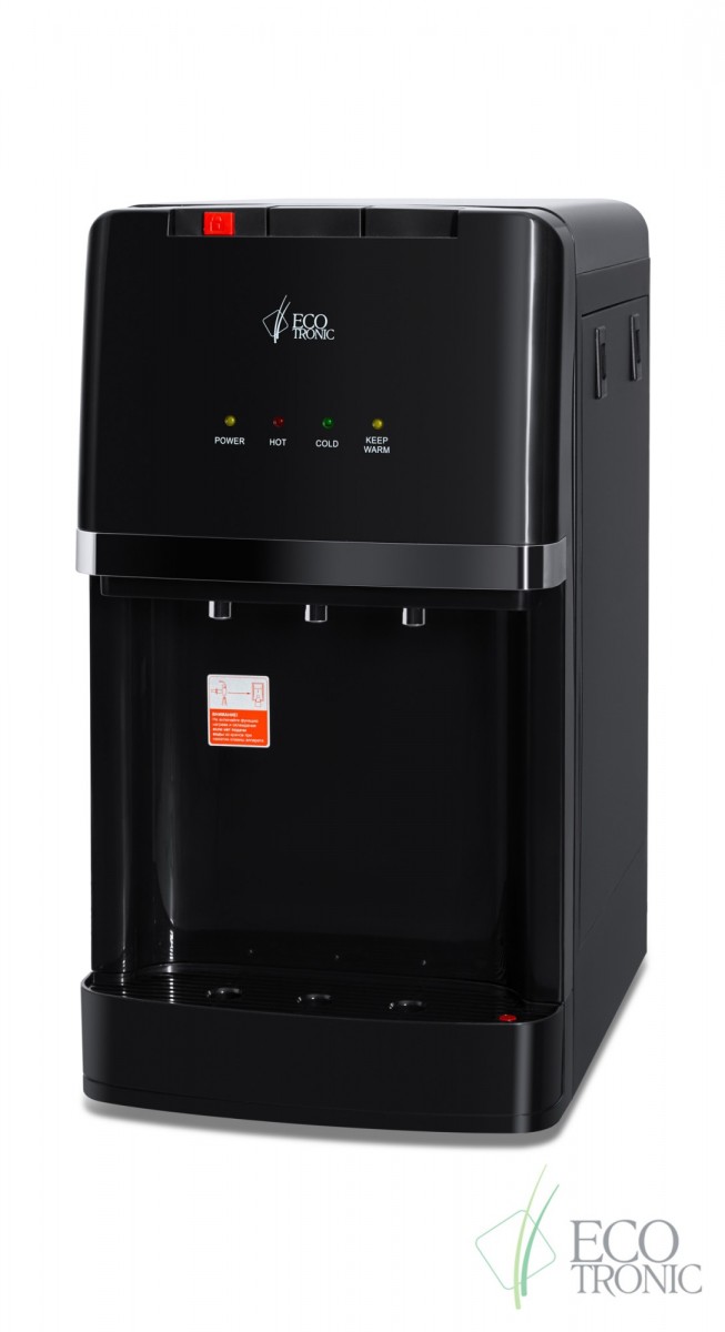 Пурифайер настольного типа с ультрафильтрационной системой очистки воды. Электронное охлаждение. Стильный дизайн. Три крана типа "клавиши": подачи горячей воды с защитой от детей, холодной воды и подачи воды комнатной температуры из бутыли. Индикация работы пурифайера, нагрева и охлаждения воды. Корпус черного цвета с серебристым декором.