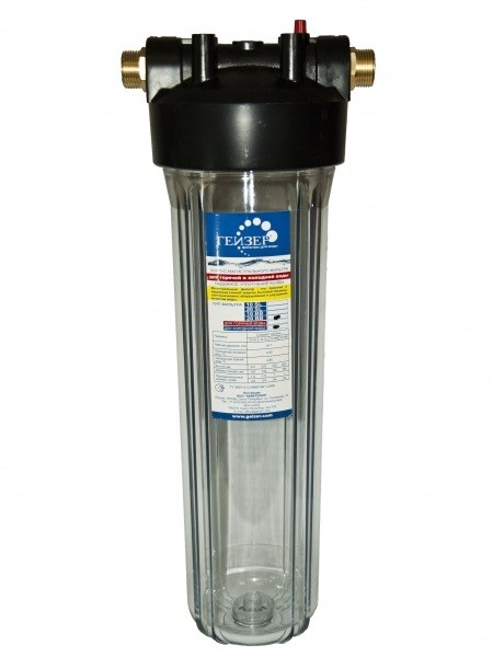 Корпус Гейзер 20BB (прозрачный). Изготовлен из прозрачного полипропилена, крышка корпуса - из полипропилена. Корпус рассчитан на работу под давлением и установку на входе в систему холодного водоснабжения. Используется с картриджами стандарта Big Blue 20". Максимальное рабочее давление - 7 атм. Максимальная рабочая температура - 40 °С. Присоединительный размер - 1"
