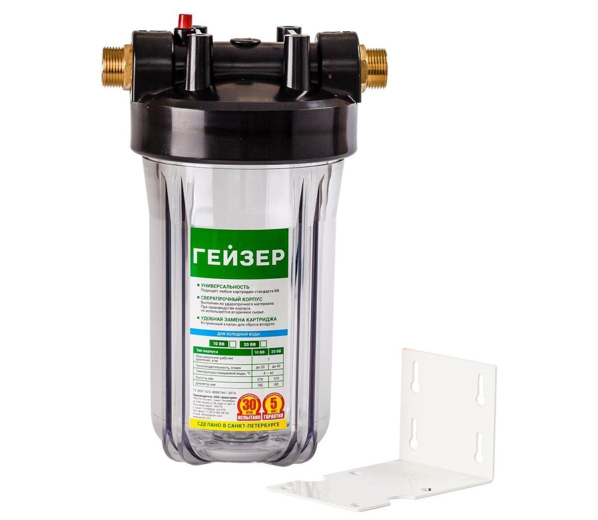 Корпус фильтра Гейзер 10BB изготовлен из прозрачного пластика; крышка корпуса – из материала АВС. Корпус рассчитан на работу под давлением и установку на входе в систему холодного водоснабжения. В производстве корпусов используется только первичное сырье пищевого класса.