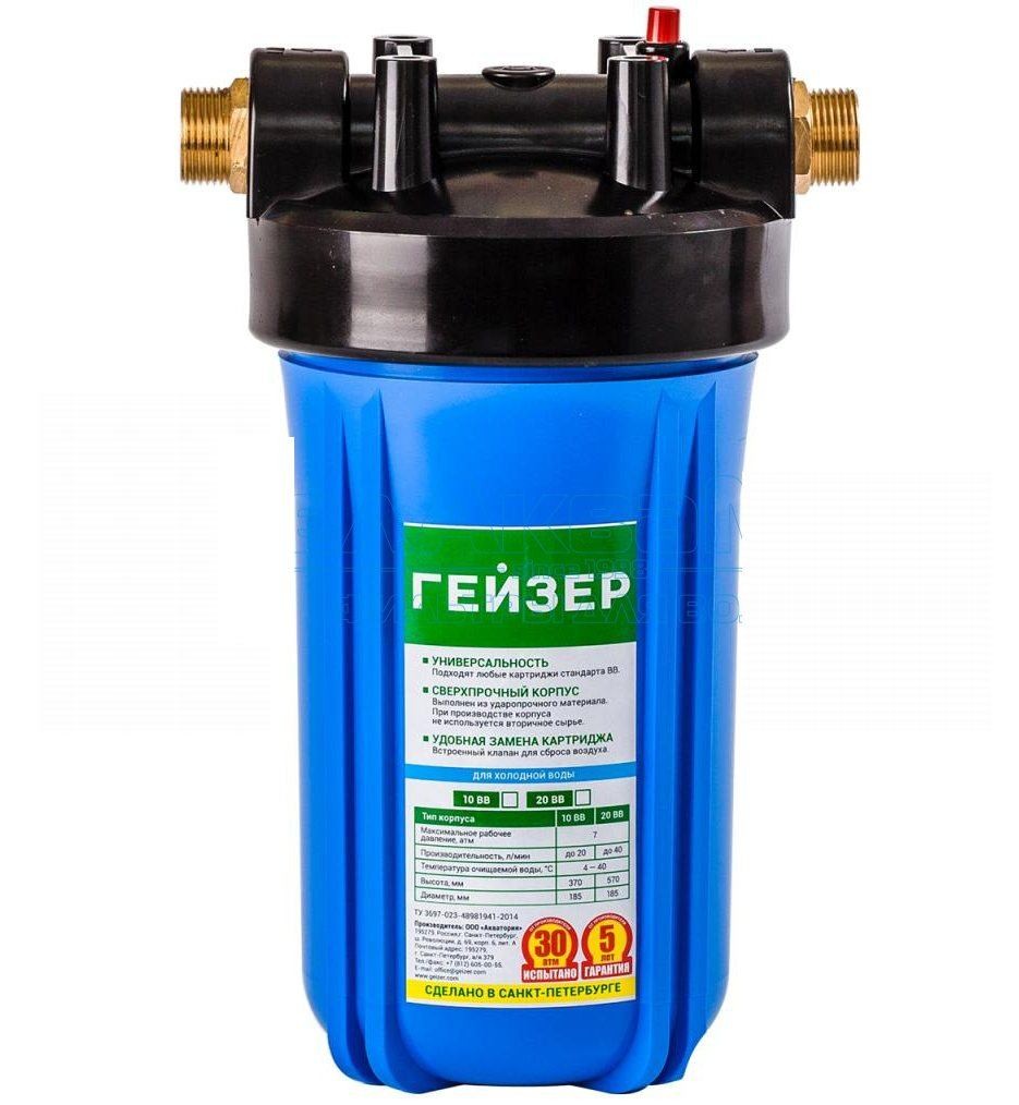 В водоочистителе Гейзер Джамбо 10 применяется картридж ПФМ 10 ВВ из специального вспененного полипропилена устойчивого к воздействию высоких температур. Различная плотность намотки полипропилена позволяет получить переменную пористость фильтрующего материала. Крупные и мелкие твердые частицы заполняют картридж по всему его объему от периферии к центру, что увеличивает ресурс, производительность и качество фильтрации картриджа. За счет этого увеличивается ресурс картриджа, его производительность и качество фильтрации. Корпус фильтра выполнен из прочного пластика. Тип корпуса – Big Blue 10" (диаметр используемых картриджей 114–117 мм) Присоединиетльный размер 1"