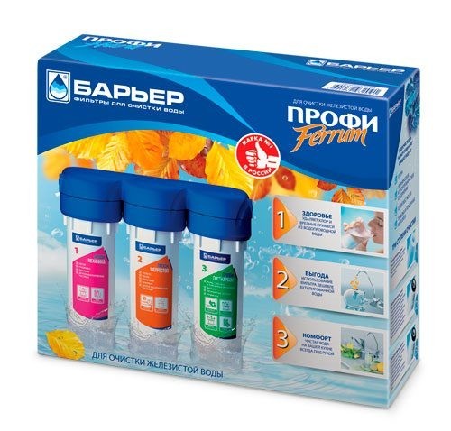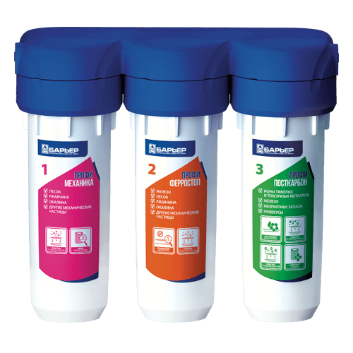 БАРЬЕР ПРОФИ Ферростоп - уникальная технология FERROSTOP дает превосходный результат очистки от железа при высоких концентрациях (до 5ПДК). Слой переменной пористости осуществляет дополнительную очистку воды от механических загрязнений. Тонкость фильтрования от 20 до 5 мкм. Финишный слой - 1 мкм.