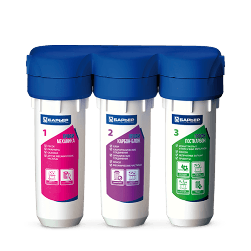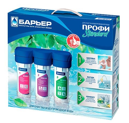 Проточный фильтр Барьер Профи Standart – для водопроводной воды. Обеспечивает комплексную очистку воды. Превосходно очищает воду от активного хлора, органических и хлорорганических соединений, тяжелых и токсичных металлов и других веществ.