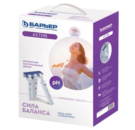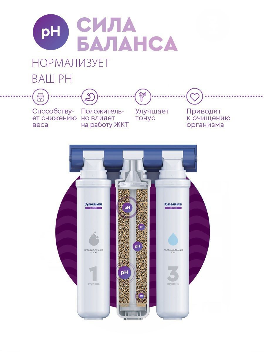 В фильтрах БАРЬЕР АКТИВ Сила Баланса используется уникальная минеральная смесь для понижения кислотности воды. В результате вы получаете воду, обогащенную минералами и имеющую щелочную среду с уровнем рН 8,5. Щелочная вода нейтрализует кислоту, восстанавливает pH баланс, необходимый для нормальной работы органов.>