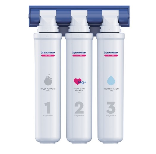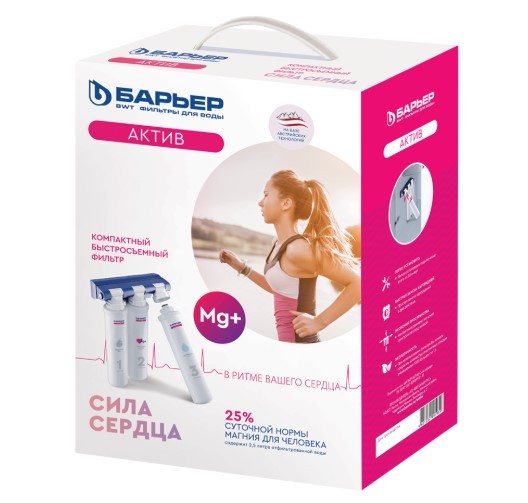 Трехступенчатый фильтр Барьер Актив Сила сердца для очистки воды от твердых примесей, хлора, органики, солей тяжелых металлов и ее последующего обогащения полезными минералами. Система разработана специально для тех, кто следит за своим здоровьем и активно занимается спортом.