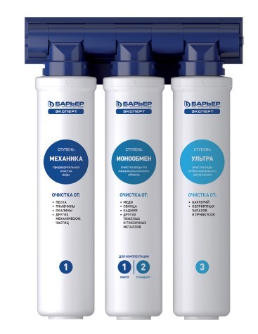 Механика, Ионообмен и Ультра - 3 ступени фильтрации, которые используются в системе Барьер Эксперт Ультра. Фильтр подходит для очистки умеренно жесткой воды, которая подается из старого водопровода. Для этих целей предусмотрена ступень очистки ультрафильтрацией - сдерживает натиск бактерий.