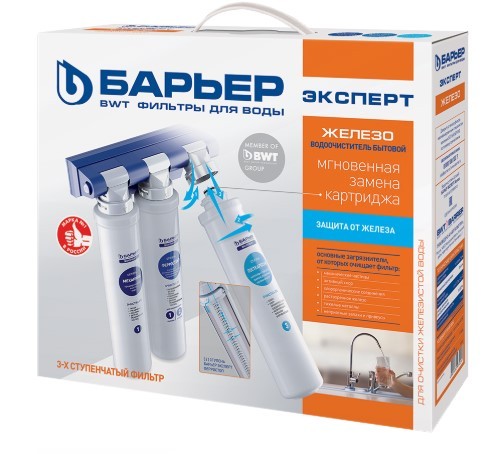 Фильтр Барьер ЭКСПЕРТ Железо под мойку для очистки водопроводной воды от вредных примесей, производительность: 2 л/мин, ресурс: 10000 л, количество ступеней очистки: 3