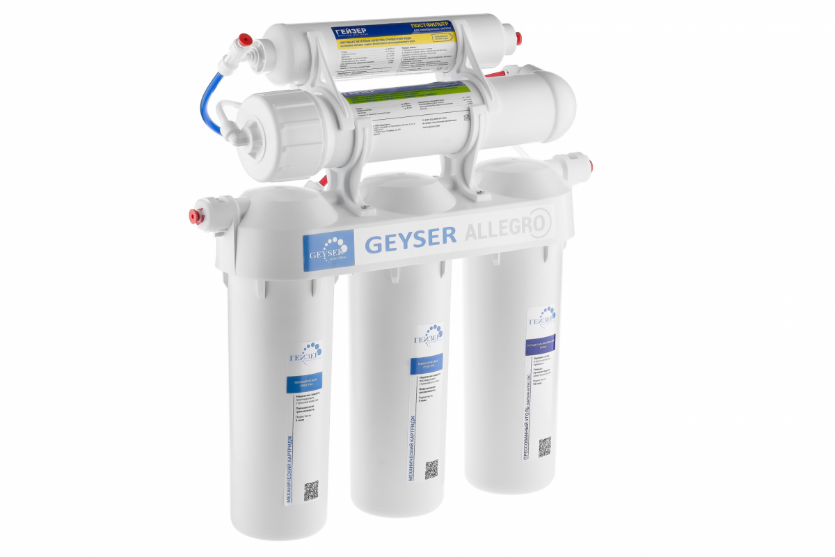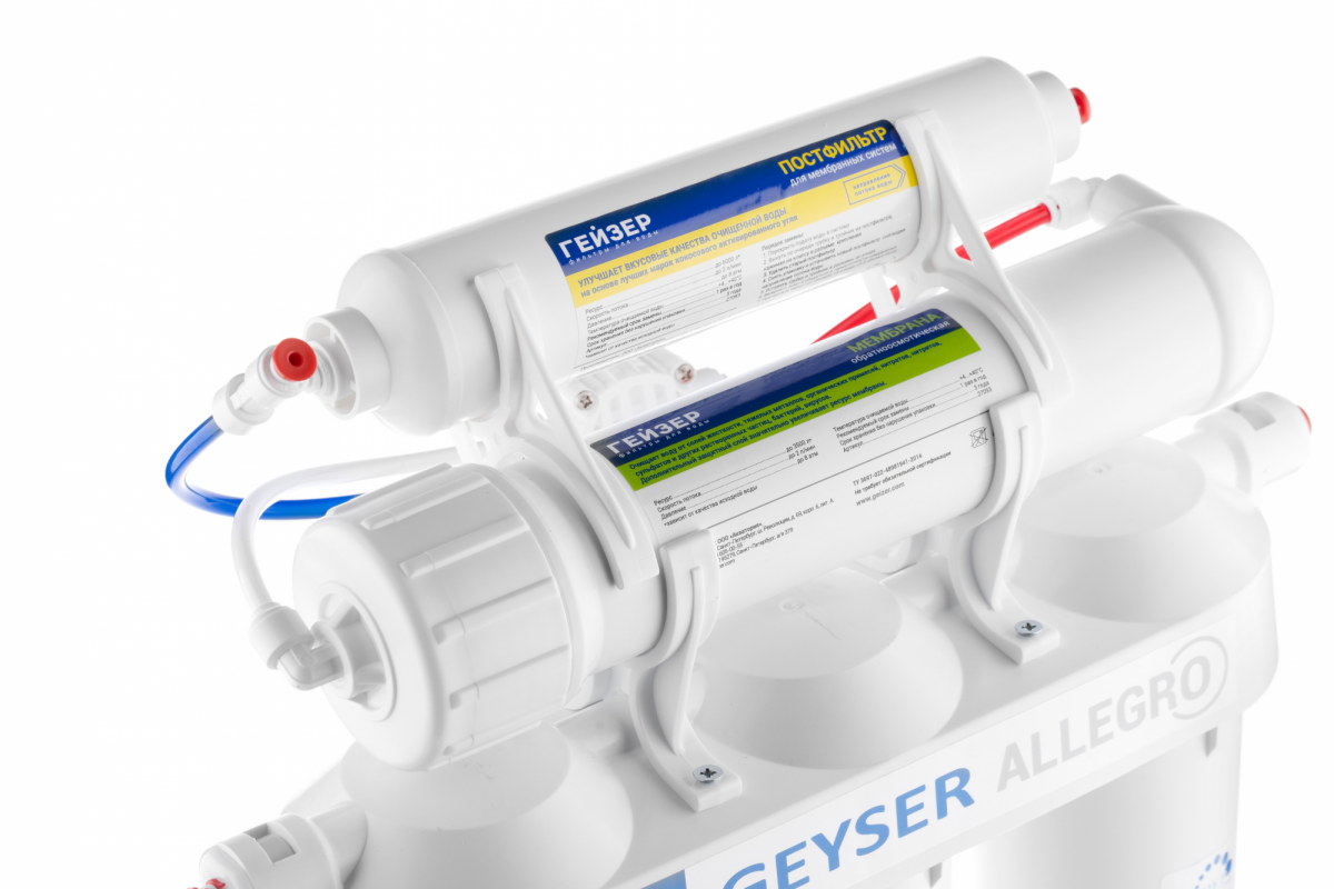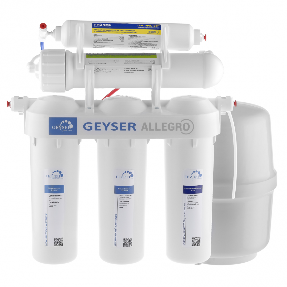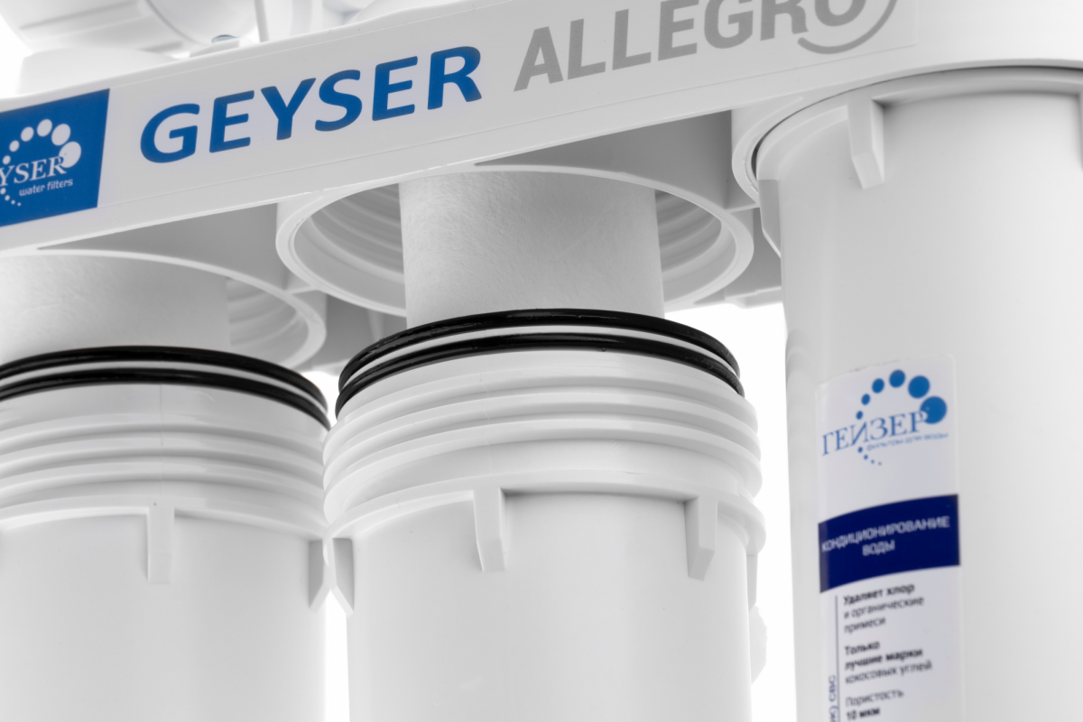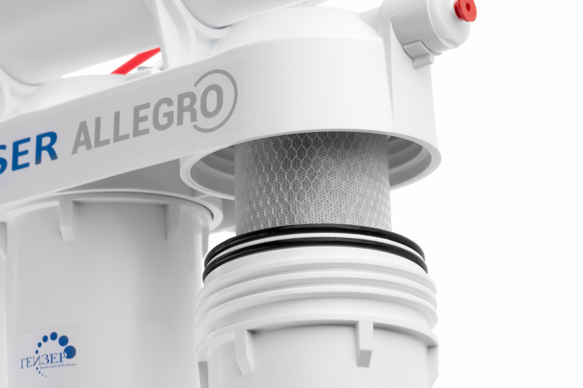 Гейзер Аллегро (без крана) идеально очищает даже очень жесткую водопроводную воду. Для установки в напорной сети колбы имеют двойное уплотнение. Корпус выдерживает давление в 25 атмосфер и не менее 100 тысяч циклов гидроудара. Предусмотрен специальный клапан сброса воды в дренаж при сверхнормативном давлении в гидроаккумуляторе.