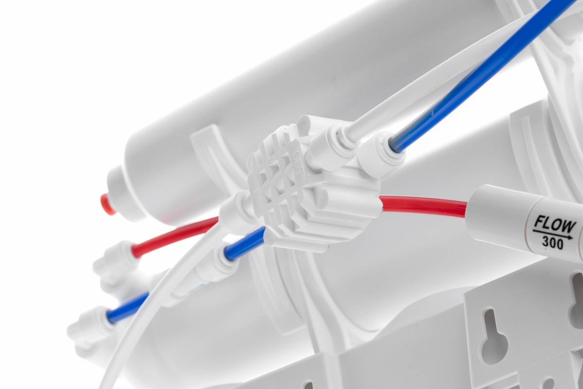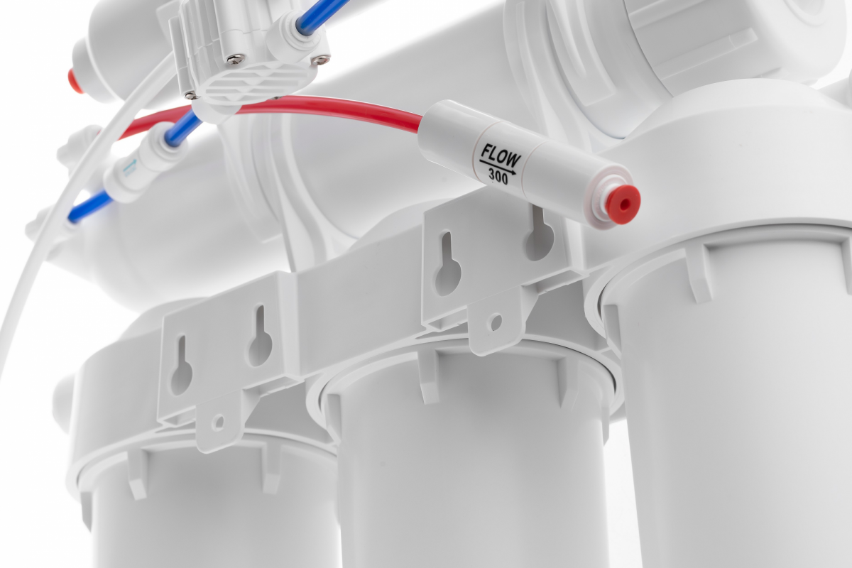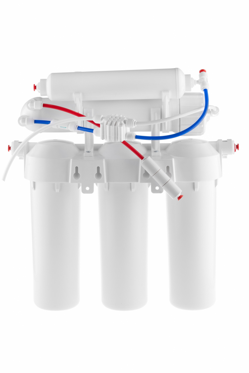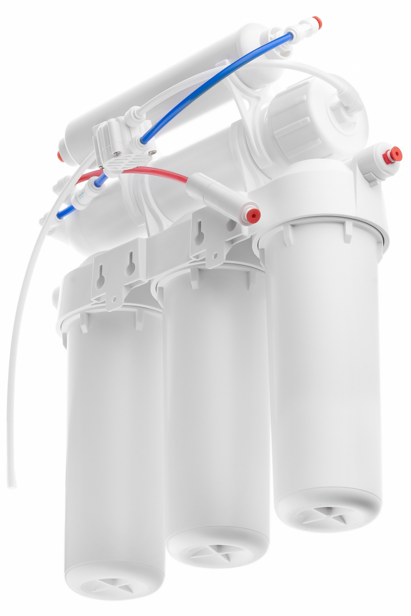 Для продления срока службы мембраны и удаления примесей на ранней стадии фильтрации используется трехступенчатая предочистка. Пара полипропиленовых модулей отфильтровывает песок, окалину и взвешенные частицы крупностью от 5 микрон. Картридж карбон-блок (CBC) из кокосового активированного угля поглощает органику, фенолы, остаточный хлор.
