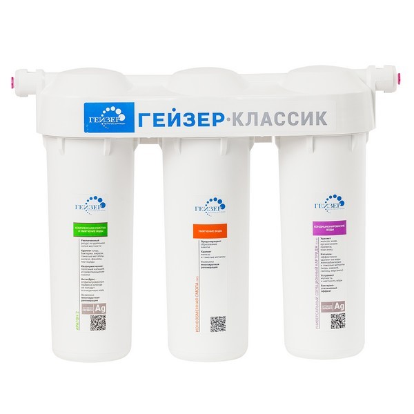 Гейзер Классик для комплексной очистки воды специально разработан для регионов с очень жесткой водой (высокий уровень минерализации). Важным свойством фильтра является наличие двух картриджей на умягчение (Арагон 2 и БС), что гарантирует высокий ресурс по удалению солей жесткости. Картридж БС можно многократно регенерировать (восстанавливать его фильтрующие свойства в домашних условиях), что позволит Вам сэкономить на покупке сменных картриджей.