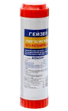 В линейке умягчающих картриджей производства Гейзер Аквасофт занимает отдельное место. Его изюминка - специальная смесь ионообменных смол питьевого класса, она не только удаляет соли кальция и магния из жидкости, но и способна эффективно работать весь период за счет равномерного распределения загрузки. Фильтрующий элемент устанавливается в первую колбу проточного фильтра Гейзер Макс. Начинка спрятана в пластиковый корпус, надежно защищена от вредного воздействия внешней среды. Справляться со своими функциями Аквасофт способен на протяжении года.