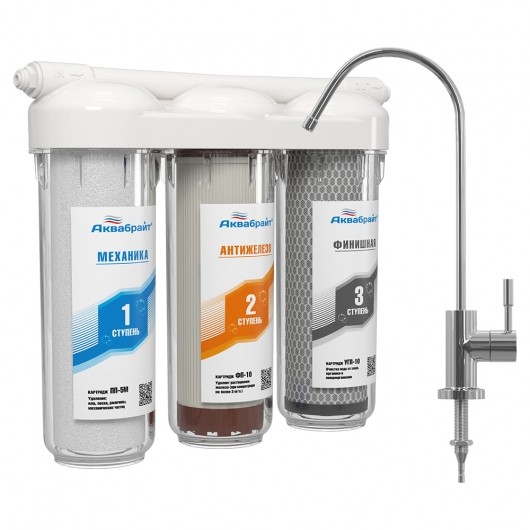 Трехступенчатая система очистки воды АКВАБРАЙТ АБФ-ТРИА-АНТИЖЕЛЕЗО очищает от хлорорганических соединений, железа, пестицидов, тяжелых металлов, бактерий и вирусов