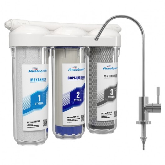 Трехступенчатая система очистки воды АКВАБРАЙТ АБФ-ТРИА-СТАНДАРТ очищает от хлорорганических соединений, железа, пестицидов, тяжелых металлов, бактерий и вирусов. Рекомендуется для подготовки питьевой воды.
