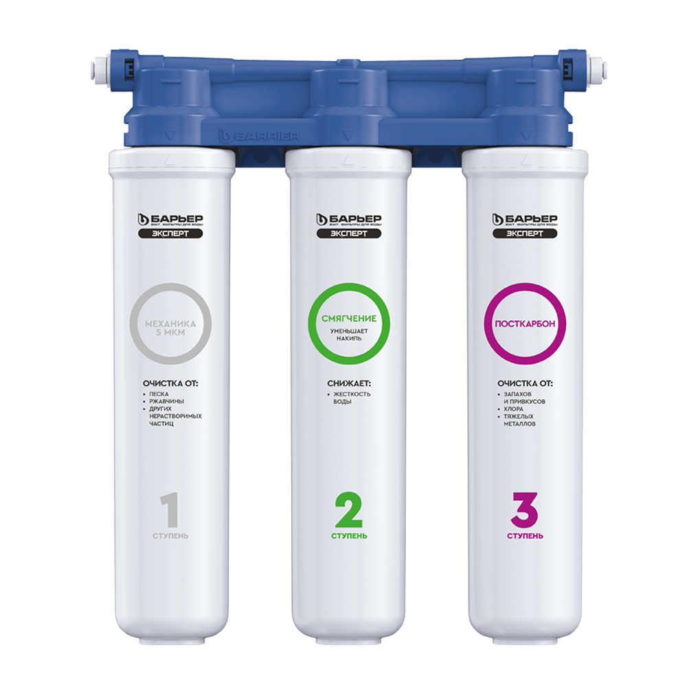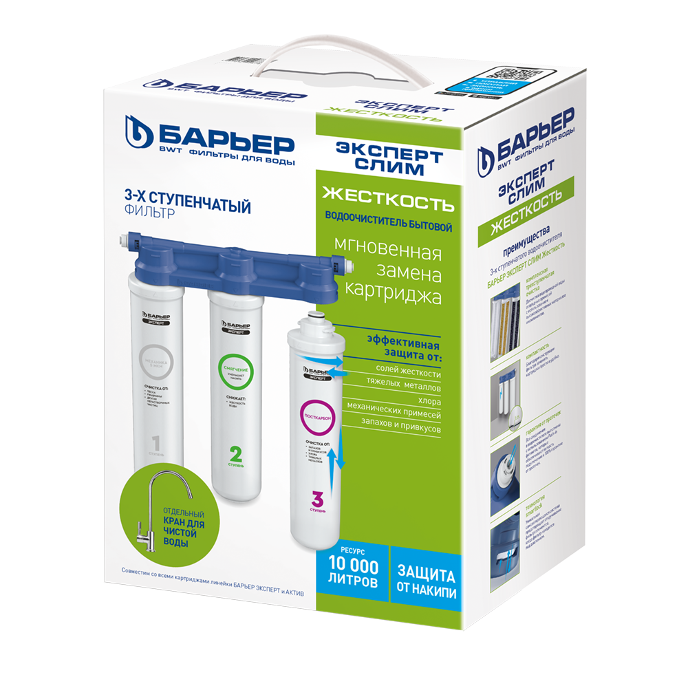Водоочиститель Барьер ЭКСПЕРТ Slim Жесткость производительность: 2 л/мин, ресурс: 10000 л, количество ступеней очистки: 3