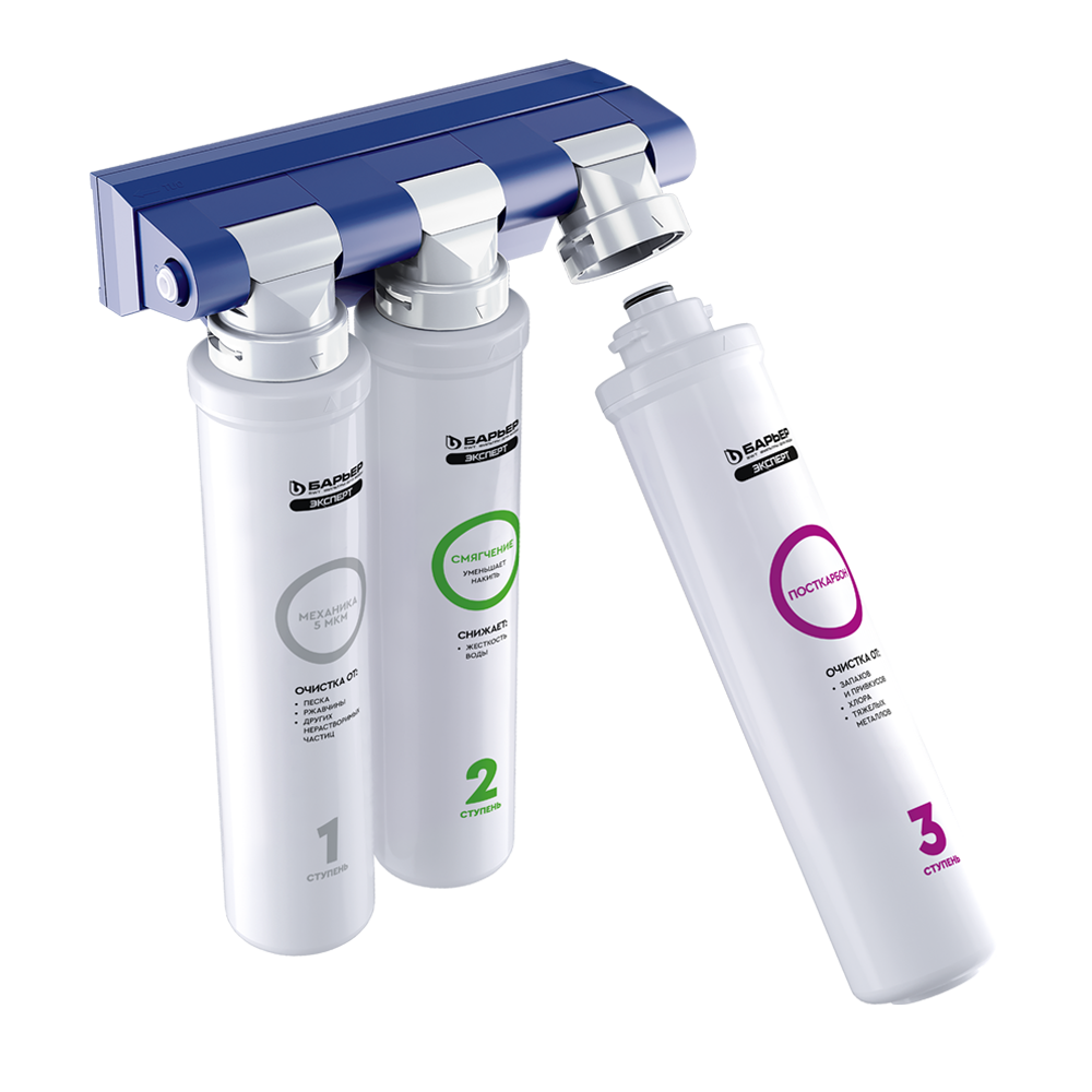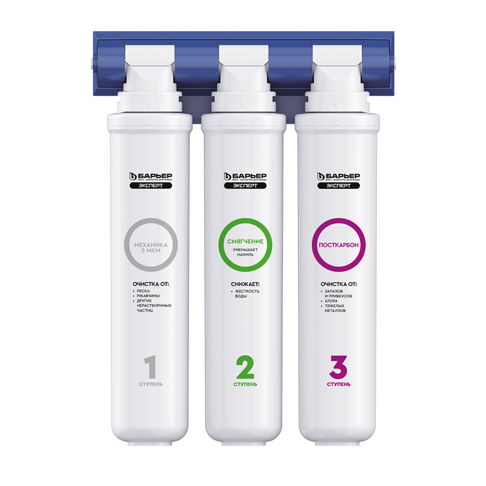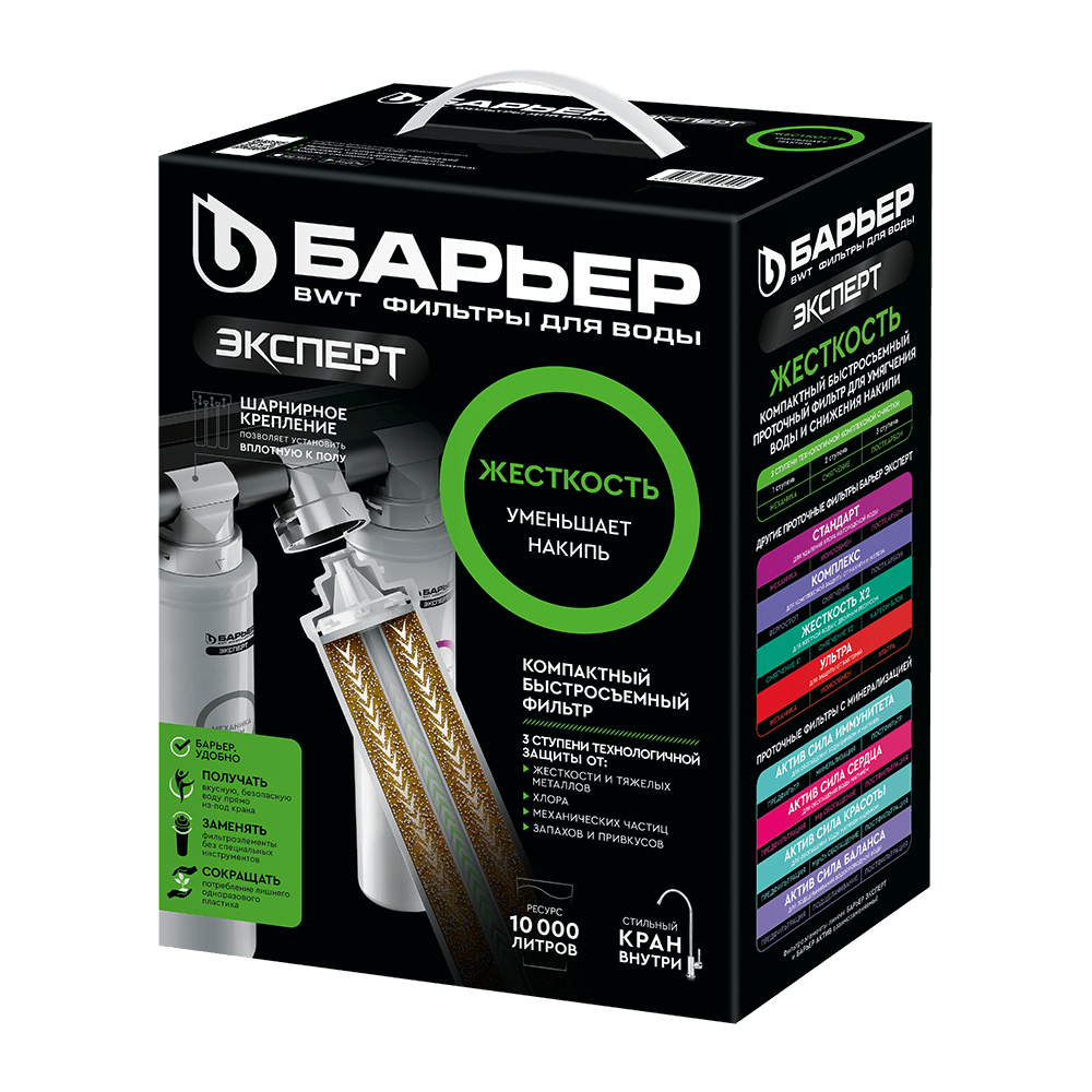 Водоочиститель Барьер ЭКСПЕРТ Жёсткость производительность: 2 л/мин, ресурс: 10000 л, количество ступеней очистки: 3