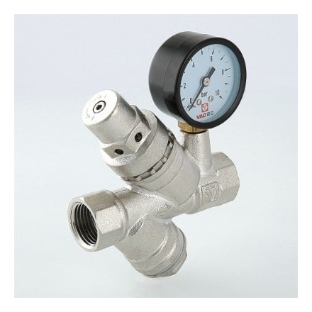 Редуктор давления VT.082 предназначен для регулируемого снижения давления рабочей среды в сетях холодного и горячего водоснабжения при вводе водопровода в квартиру. Регулирование происходит по схеме «после себя». Редуктор снабжен манометром, который позволяет производить точную настройку выходного давления и дает возможность контролировать давление при водоразборе. Для защиты поршневых уплотнений и внутренней импульсной линии редуктор совмещен с косым фильтром механической очистки с размером ячейки 200 мкм. Пробка косого фильтра имеет ушко для пломбировки. В конструктивном плане редуктор выполнен пружинным, поршневым, регулируемым. Настройка и регулировка выходного давления производятся с помощью отвертки с плоским шлицем. Редуктор полностью ремонтопригоден, любой его элемент может быть отремонтирован или заменен. Редуктор рекомендуется устанавливать сразу после входного крана, перед водосчетчиком.