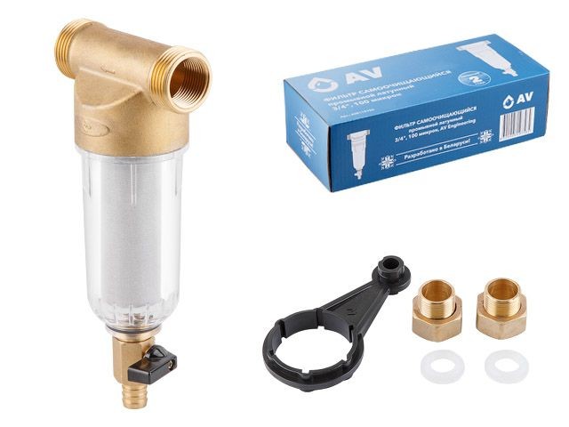 Фильтр магистральный самопромывной AV Engineering 3/4" 100 мкм (AVE115704) с сеточным картриджем из нержавеющей стали, 100 микрон. Используется для холодной воды. Максимальная рабочая температура - 40 °С.