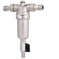 В процессе работы вода проходит через сетчатый фильтр к выпускному отверстию корпуса. Осадок собирается в нижней части фильтра и удаляется при открытии сливного крана, который расположен снизу на чашке фильтра. Вода направляется в слив, промывая фильтр и удаляя осадок, при этом, часть воды продолжает фильтроваться и поступать в магистраль, что и обеспечивает непрерывное водоснабжение.