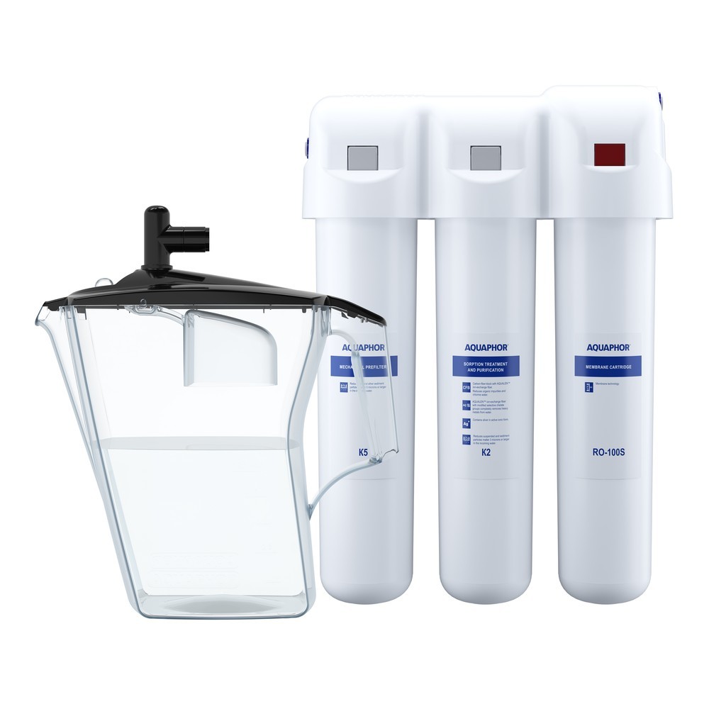 Вам подойдет Аквафор DWM-31, если вы ищите самый компактный и простой в обращении фильтр обратного осмоса. У данной модели нет накопительного бака, как у традиционных фильтров обратного осмоса. За счет этого экономится место под мойкой. Кроме того, вы сами определяете, сколько воды хотите набрать “про запас”. В комплект фильтра входит отсекатель: он позволит использовать любую емкость в качестве накопителя. Также к фильтру прилагается 3-литровый кувшин – можно подсоединить фильтр к нему. В любом случае, следить за процессом нет необходимости: подача воды из фильтра прекратится автоматически, когда емкость наполнится.