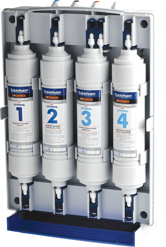 Предназначен для глубокой очистки воды от растворенных веществ и механических примесей, которые могут в ней находиться. Фильтр обратного осмоса Барьер К-ОСМОС для очистки питьевой воды представляет собой корпус с картриджами, накопительный бак и отдельный кран для воды, соединенные шлангами.