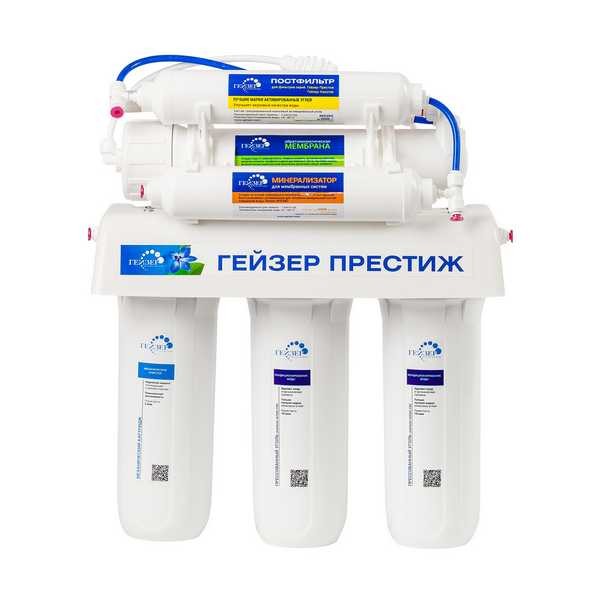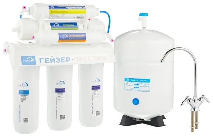 Система обратного осмоса Гейзер Престиж удаляет из воды 99.8% всех растворенных и нерастворенных в ней веществ, включая бактерии и вирусы, проста в установке, имеет современный, эстетичный и эргономичный вид, производит чистую воду без примесей токсинов и канцерогенов, тяжелых металлов и бактерий, комплектуется переходниками, баком, отдельным краном и ключом для простоты обслуживания.