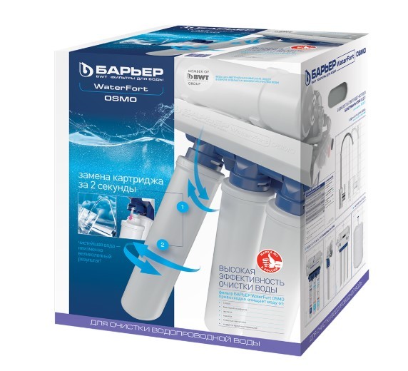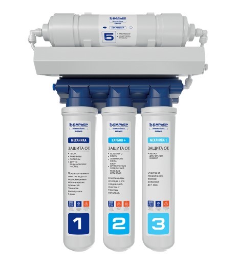 Фильтр Барьер WaterFort OSMO 5-ступенчатый, на основе обратного осмоса состоит из блока предфильтров, мембраны, накопительного бака и постфильтра. Обратный осмос обеспечивает очистку от всех примесей на 99,9%. Он удаляет из воды: хлор, хлорорганические соединения, нитраты, тяжелые и токсичные металлы, соли жесткости, нефтепродукты, бактерии и вирусы, механические загрязнения.