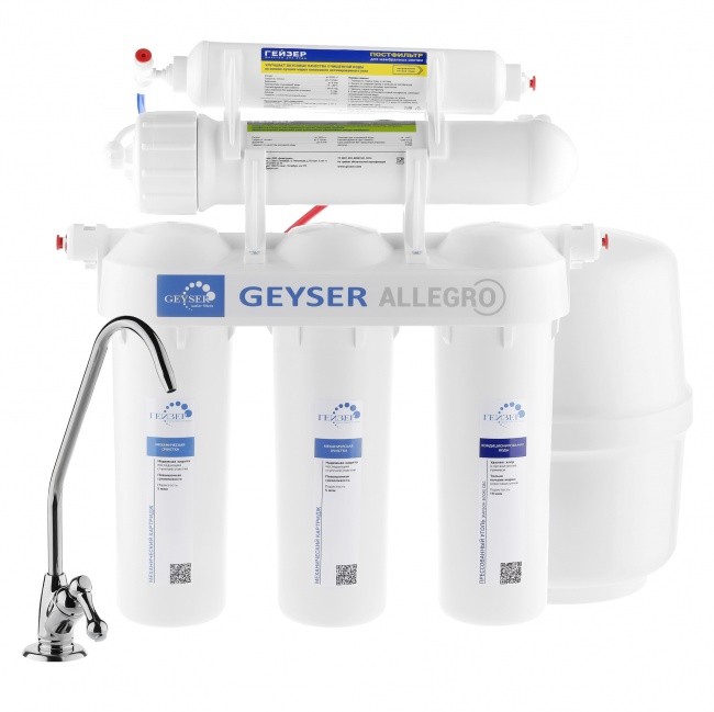 Фильтр Гейзер-Аллегро используется для глубокой очистки водопроводной воды методом обратного осмоса от солей жесткости, тяжелых металлов, механических примесей, хлора и органических соединений, фенолов, бактерий и вирусов. Система устраняет из воды посторонний привкус, запах и цвет.