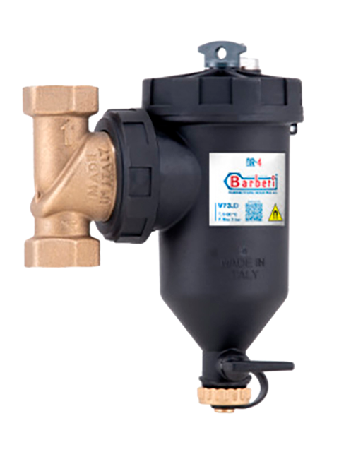 Фильтры-сепараторы Barberi серии DR-4 с магнитным грязеуловителем задерживают примеси, содержащиеся в отопительной жидкости, воде, благодаря совместному действию четырех внутренних компонентов: декантация в грязеуловителе, циклонная фильтрация, фильтрация с помощью завихрения в картридже, удаление ферромагнитных частиц с помощью извлекаемого магнитного стержня.