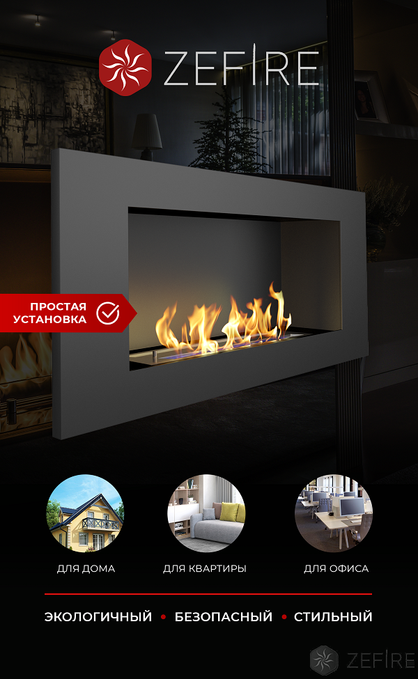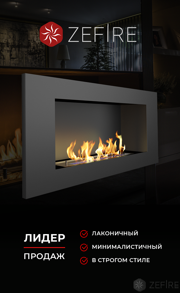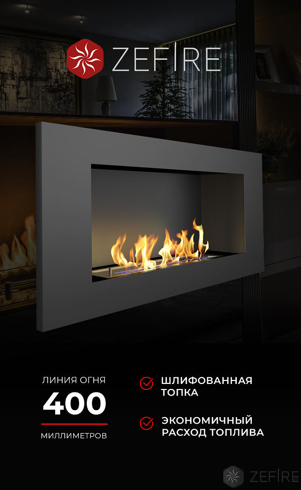 Биокамин Zefire Elliot 900, объем топки 2,5 л, линия огня 400 мм, габариты камина 400х900х176 мм, портал в комплекте