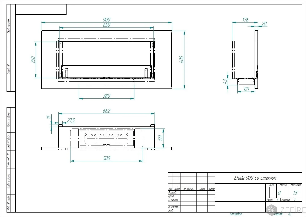 Биокамин Zefire Etude 900 (Estetic Flame), объем топки 1,7 л, линия огня 300 мм, габариты камина 400х900х176 мм, портал в комплекте
