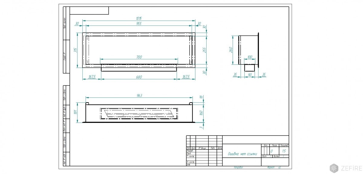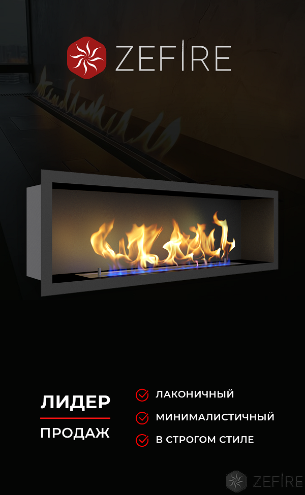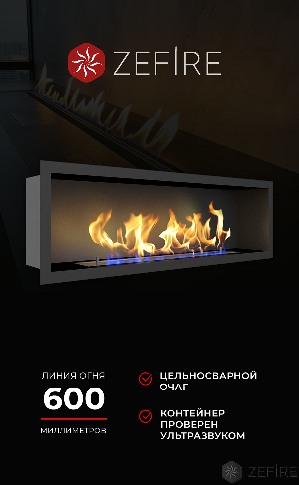 Биокамин Zefire Flagman 1000, объем топки 3,5 л, линия огня 600 мм, габариты камина 315х1015х181 мм