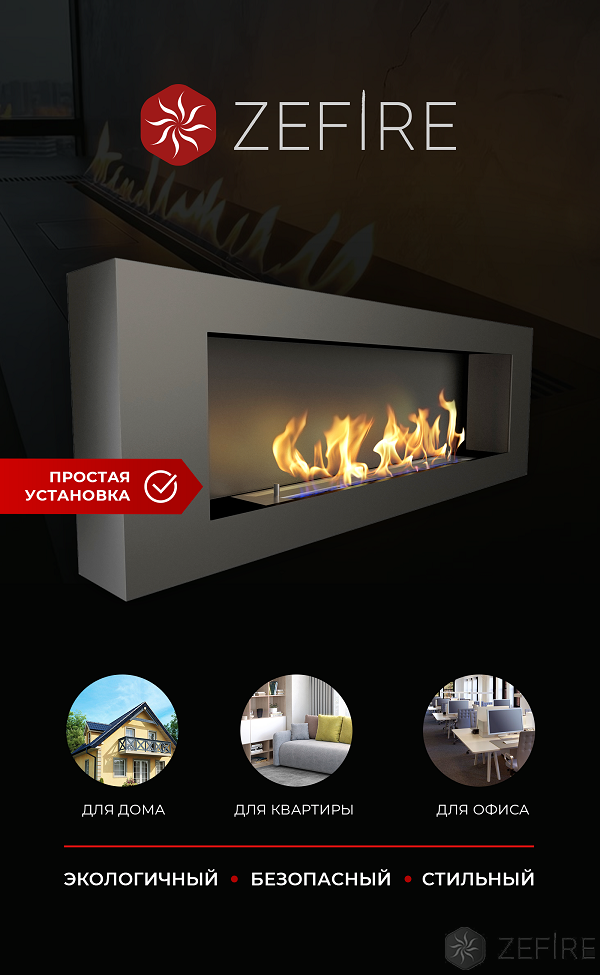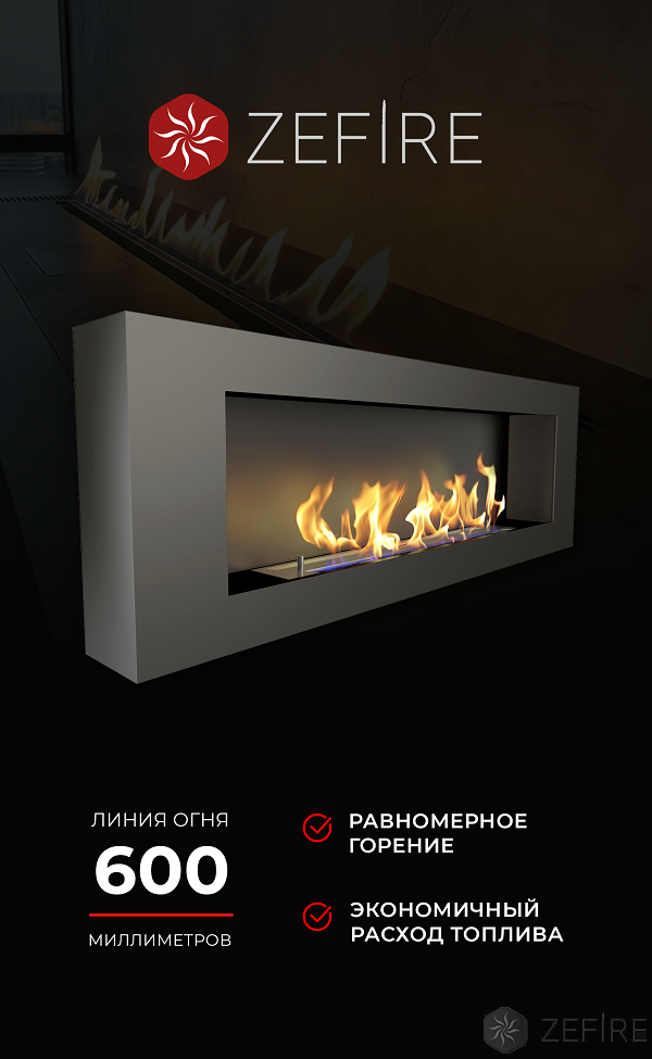 Биокамин Zefire Orion 1200, подвесной/настенный, объем заправки 3,5 л, линия огня 600 мм, габариты камина 400х1200х131 мм, портал в комплекте