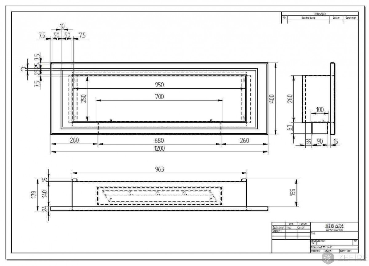 Биокамин Zefire Sirius 1200 под стемалит, встраиваемый/настенный, объем топки 3,5 л, линия огня 600 мм, габариты камина 400х1200х176 мм
