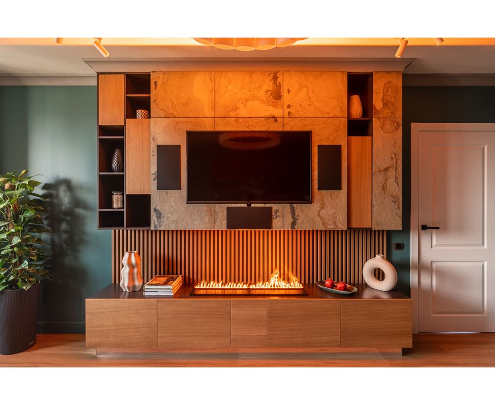В очаге Cassette 1000 серии Projects не используются дрова или какое-либо другое декоративное топливо. Вы можете добавить декор по своему вкусу (камни, кристаллы, угли, дрова) или использовать его в первоначальном виде, это смотрится очень оригинально и стильно, работает только от водопровода.