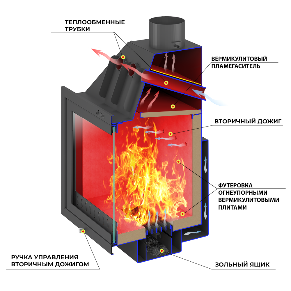 Пламя и дымовые газы, догорая, огибают пламегаситель в верхней части топочной камеры. В дымосборнике над конвекционными трубами расположен второй пламегаситель, который повторно меняет направление движения газов и таким образом способствует их полному догоранию в топке. За счёт совместной работы двух пламегасителей достигается максимальная тепловая эффективность каминной топки АСТОН 600, в том числе повышается теплоотдача печи путём усиления конвекции.