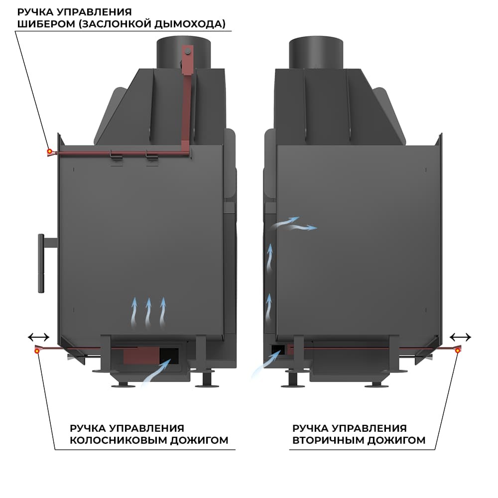 Топка оборудована системой вторичного дожига дымовых газов, которая позволяет получить максимум энергии при горении дров. Каналы вторичного дожига расположены на задней стенке топочной камеры прямо в вермикулитовой облицовке.