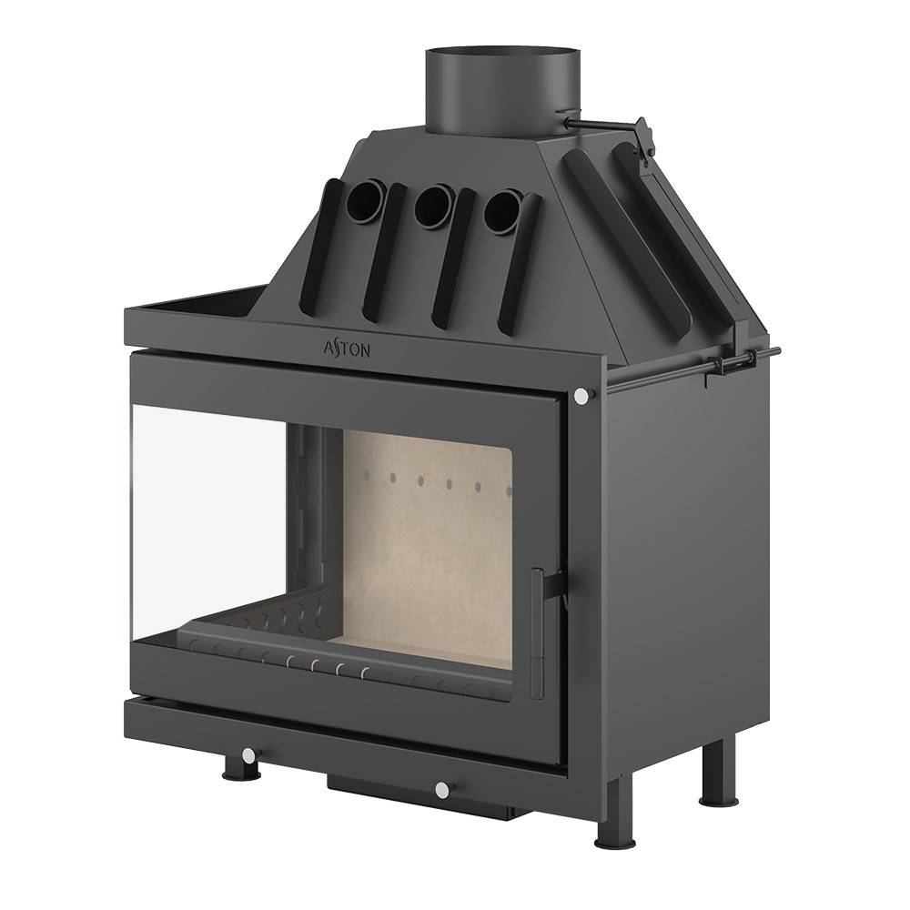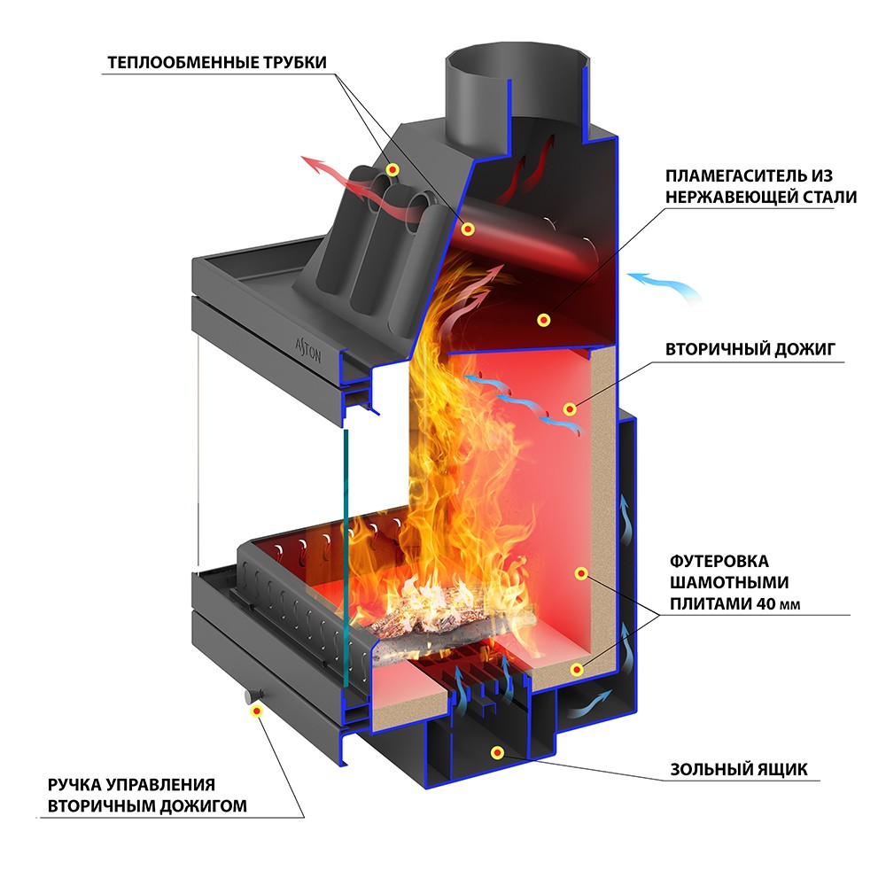 Трубы, размещённые над топочной камерой в области дымосборника, увеличивают скорость движения нагретого воздуха и усиливают конвекционные возможности каминной топки АСТОН 700 L. Пламя и дымовые газы, догорая, огибают пламегаситель в верхней части топочной камеры. В дымосборнике.