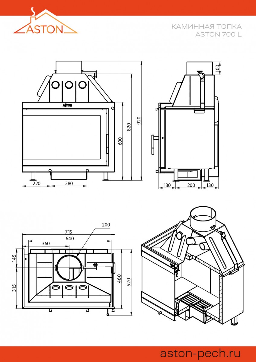 Каминная топка ASTON 700 L, мощность 14 кВт, материал топки - сталь, объем помещения 280 м3, вес 130 кг