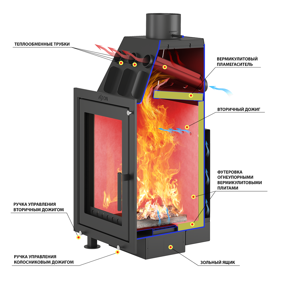 Топка оборудована системой вторичного дожига дымовых газов, которая позволяет получить максимум энергии при горении дров. Каналы вторичного дожига расположены на задней стенке топочной камеры непосредственно в вермикулитовой облицовке. Управление вторичным дожигом вынесено на переднюю панель топки