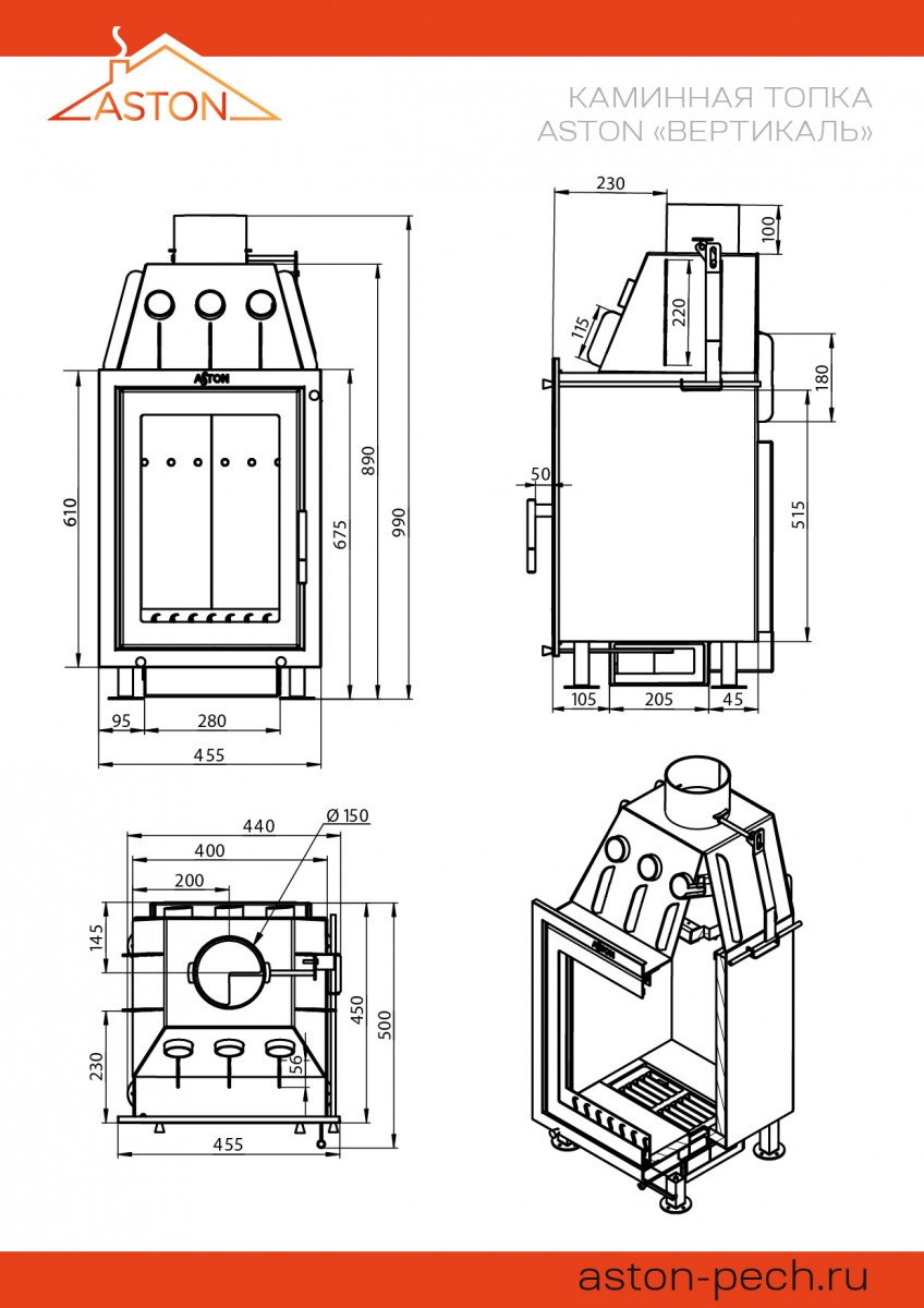 Каминная топка ASTON Вертикаль, мощность 10 кВт, материал топки - сталь, объем помещения 210 м3, вес 80 кг