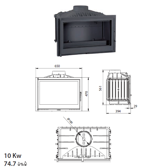 Дымовой патрубок каминной топки Ferguss FG-17 имеет диаметр 180мм и оснащен встроенным чугунным шибером, позволяющим регулировать интенсивность горения.