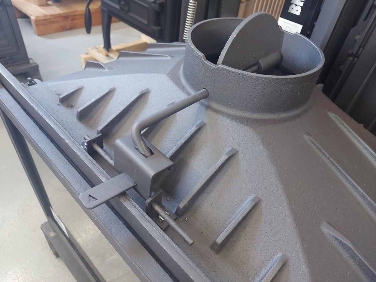 В верхней части топки располагается массивный чугунный отбойник пламени, предотвращающий попадание огня в дымоход. Данный отбойник принимает на себя основной термический удар, поэтому он увесистый и имеет ребра жесткости, обеспечивающие стабильность его формы.