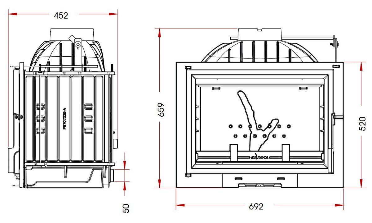 Каминная топка Invicta PHILOS 700 GA, мощность 10 кВт, материал топки - чугун, объем помещения 250 м3, вес 110 кг, зольник