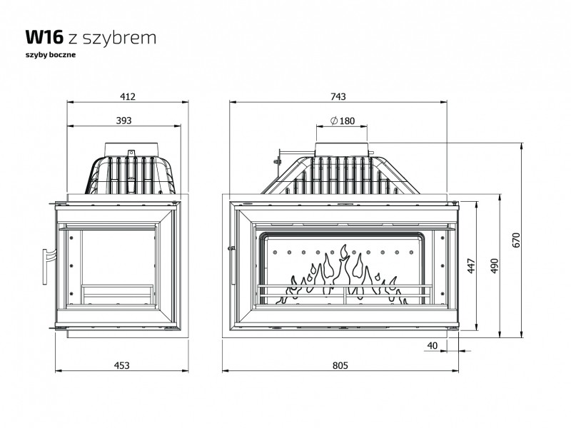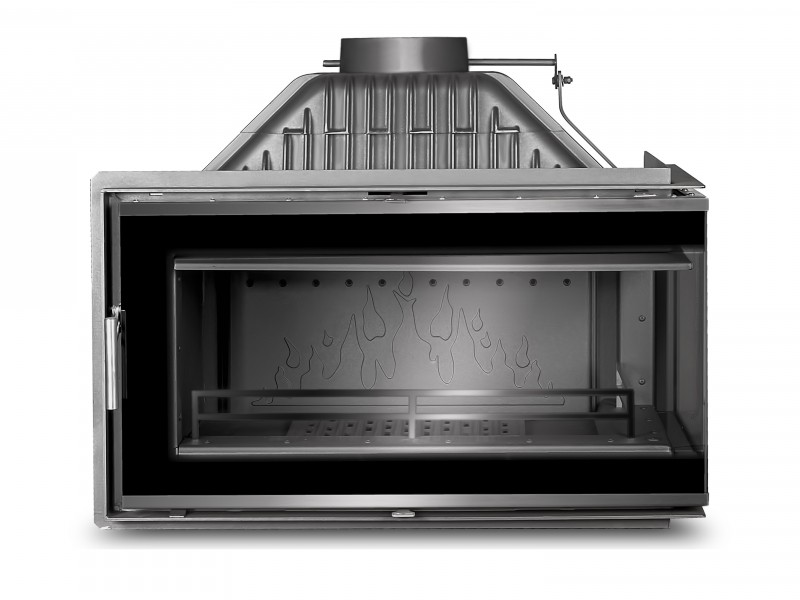 Каминная топка W16 PB с угловым правым стеклом без рамы (14.7 kW) с отличными характеристиками и великолепной ценой, используется для отопления помещений, а также как предмет интерьера. Выполнена из чугуна класса EN-GJL- 200, представляет собой качественный дизайнерский отопительный прибор. Система подачи наружного воздуха на главное стекло с регулировкой, подавая воздух на внутреннюю сторону стекла, вы, тем самым, создаете направленный поток, который будет препятствовать оседанию сажи, стекло значительно дольше будет оставаться чистым, чтобы вы наслаждались игрой живого укрощенного огня. Стекло дверцы увеличено и закрывает всю рамку рамку дверцы, верх и низ стекла декорирован нержавейкой (серебро), что визуально подчёркивает ширину стекла и безрамность конструкции дверцы.