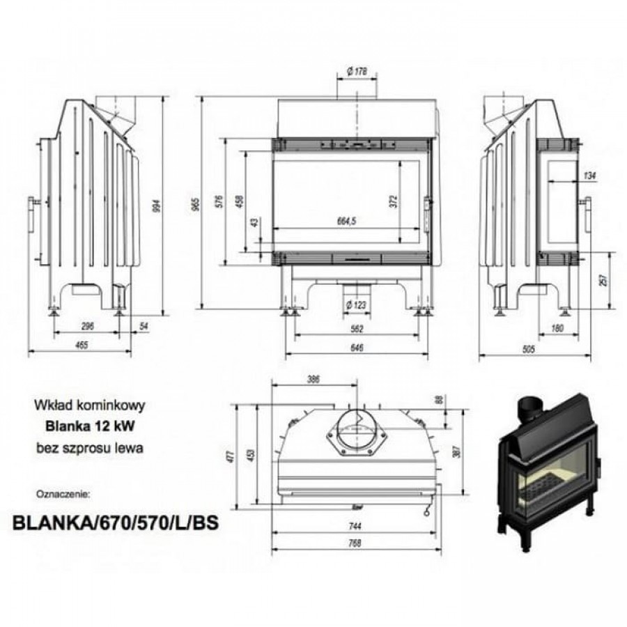 Топка-камин Kratki Blanka 670/570/L/BS (угловое стекло слева)