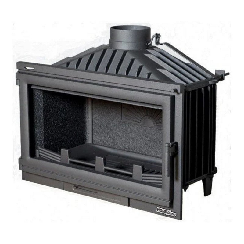 Широкоформатная каминная топка Nordflam Bergamo изготовлена из чугуна и имеет ширину 900мм! Топка оснащена регулируемой подачей воздуха на стекло. В верхней части топки располагается ручка для открытия/закрытия подачи воздуха. Таким образом сажа со стекла выгорает лучше благодаря направленному потоку воздуха. В задней стенке топки располагаются отверстия вторичного дожига газов. Сзади на корпусе топки имеется камера, в которой воздух разогревается и после подается в верхнюю часть топочной камеры.